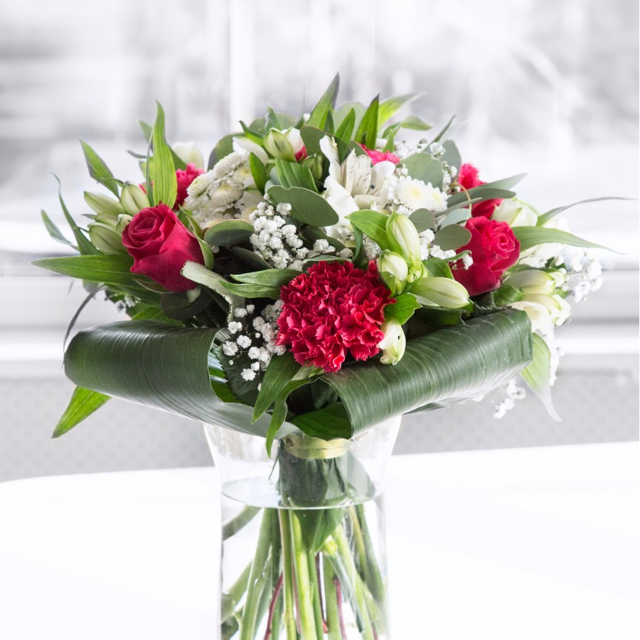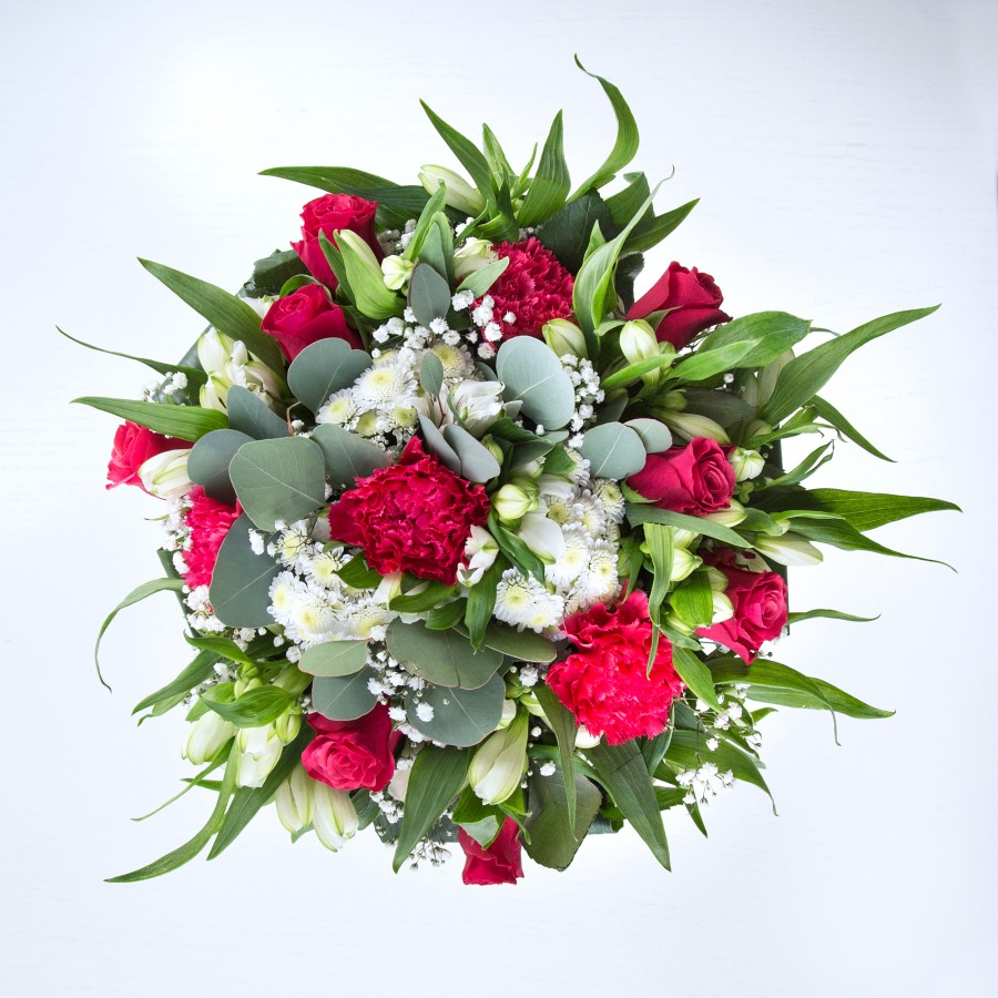 The Graceful Blooms Bouquet is a stunning arrangement featuring red roses, carnations, and white chrysanthemums, complemented by gypsophila, white alstroemeria, and aspidistra leaves. This unique bouquet is perfect for expressing elegance.